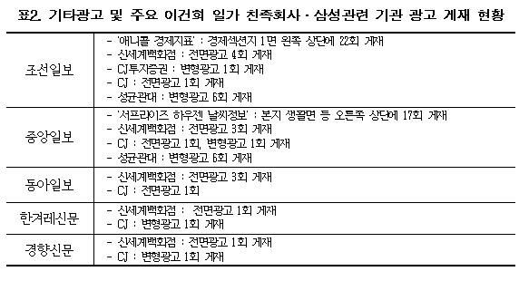 이건희 삼성 회장의 여동생인 이명희 씨가 회장으로 있는 신세계백화점의 경우 조·중·동에 각각 4회, 3회에 걸쳐 전면광고를 집행했지만, 한겨레와 경향에는 한 건씩에 싣는 데 그쳤다. 또 이건희 회장의 형인 고 이맹희 씨가 회장이던 CJ의 경우 조선일보에 CJ투자증권 1회, CJ에서 생산하는 탈모치료제 광고 1회를 집행했고, 중앙일보에 탈모치료제 광고만 2회 게재했다. CJ의 탈모치료제의 경우 비록 한겨레와 경향에도 1회씩 광고가 집행됐지만, 역시 1회에 그친 동아에서는 전면광고로 실린 데 비해 한겨레와 경향에는 변형광고에 그쳤다.