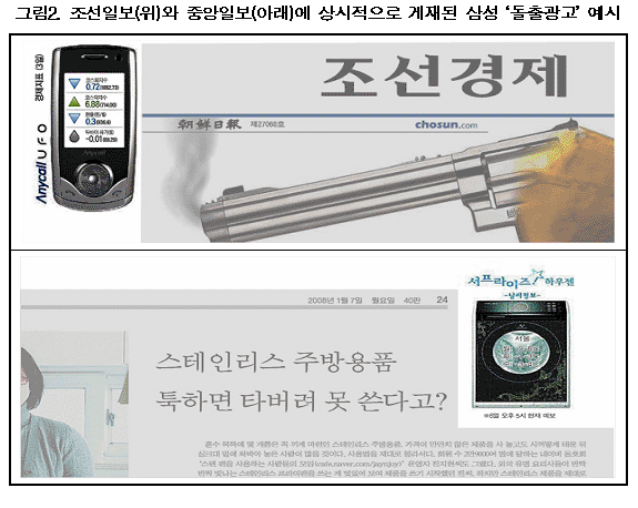 조사 기간 동안 삼성 관련 광고를 가장 많이 실었던 조선일보는 규격화된 광고 외에 이른바 ‘돌출광고’ 형식으로 삼성전자 ‘애니콜’의 휴대폰에 주가지수 등 경제지표 내용을 담아 기종을 바꿔가며 경제섹션 1면 왼쪽 상단에 22회나 게재했다. 중앙일보 또한 삼성전자 하우젠 세탁기에 날씨 정보를 담은 ‘서프라이즈 하우젠 날씨정보’ 광고를 생활·문화면 오른쪽 상단에 17회 동안 게재했다.(<그림2> 참조)