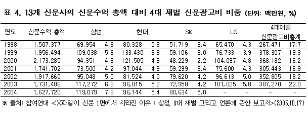 신문의 경우도 이러한 추세는 비슷하게 나타났다. 참여연대의 조사에 의하면, 2004년 10개 중앙종합일간지와 3개 경제지 전체에 대한 삼성의 광고집행액은 1190억원 정도로 역시 자세한 규모가 조사되지 않은 LG를 제외한 재벌그룹 가운데 가장 많은 광고비를 지출한 것으로 나타났다. 13개 신문의 전체 수익총액에서 삼성의 광고비는 7.3%를 차지했다. 문제는 2000년을 기점으로 신문의 수익은 점점 줄어드는 추세인 반면, 4대재벌에 대한 광고비 의존비율은 점차 늘어났다는 점이다. 특히 삼성의 광고비 비중이 다른 재벌에 비해 가파른 속도로 증가하는 추세를 보였다.