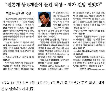 조선일보는 14일 5면 <인수위, ‘언론인 성향조사’ 파문>(박란희 기자)에서 인수위의 ‘개인적인 돌출행동’이었다는 점과 이명박 당선인의 ‘질타’를 부각해 보도했다. 특히 조선일보는 5면 <“언론계 등 5개분야 문건 작성…제가 건방 떨었다”>(이한수 기자)라는 제목으로 ‘성향조사’ 문건을 작성한 장본인인 ‘박광무 문화부 국장’의 인터뷰를 게재했다. 이 보도는 언론사찰과 이명박 정부의 연관성을 잘라내기 위한 이른바 ‘꼬리 자르기’ 보도의 전형이다.(<그림 1>참고)