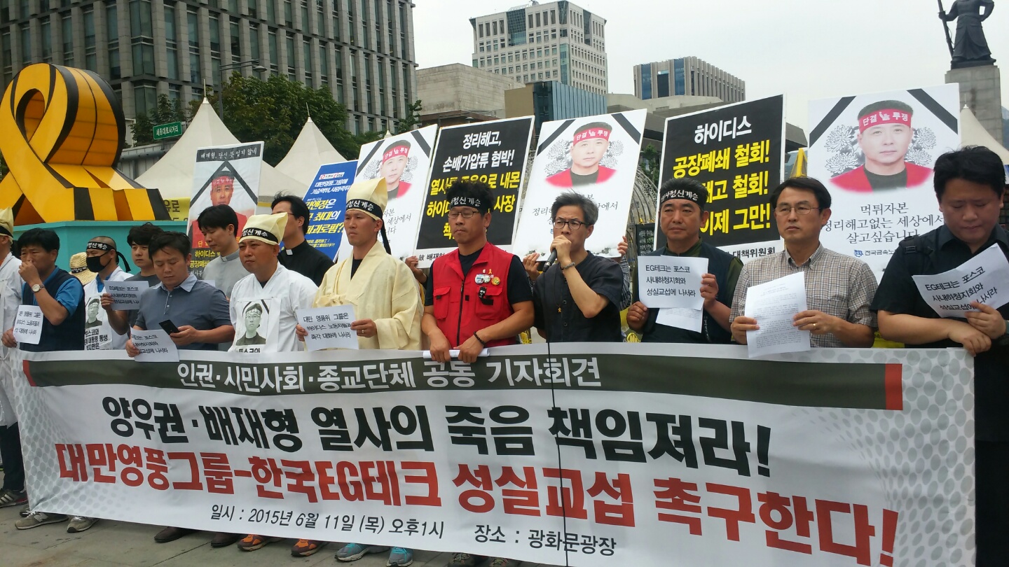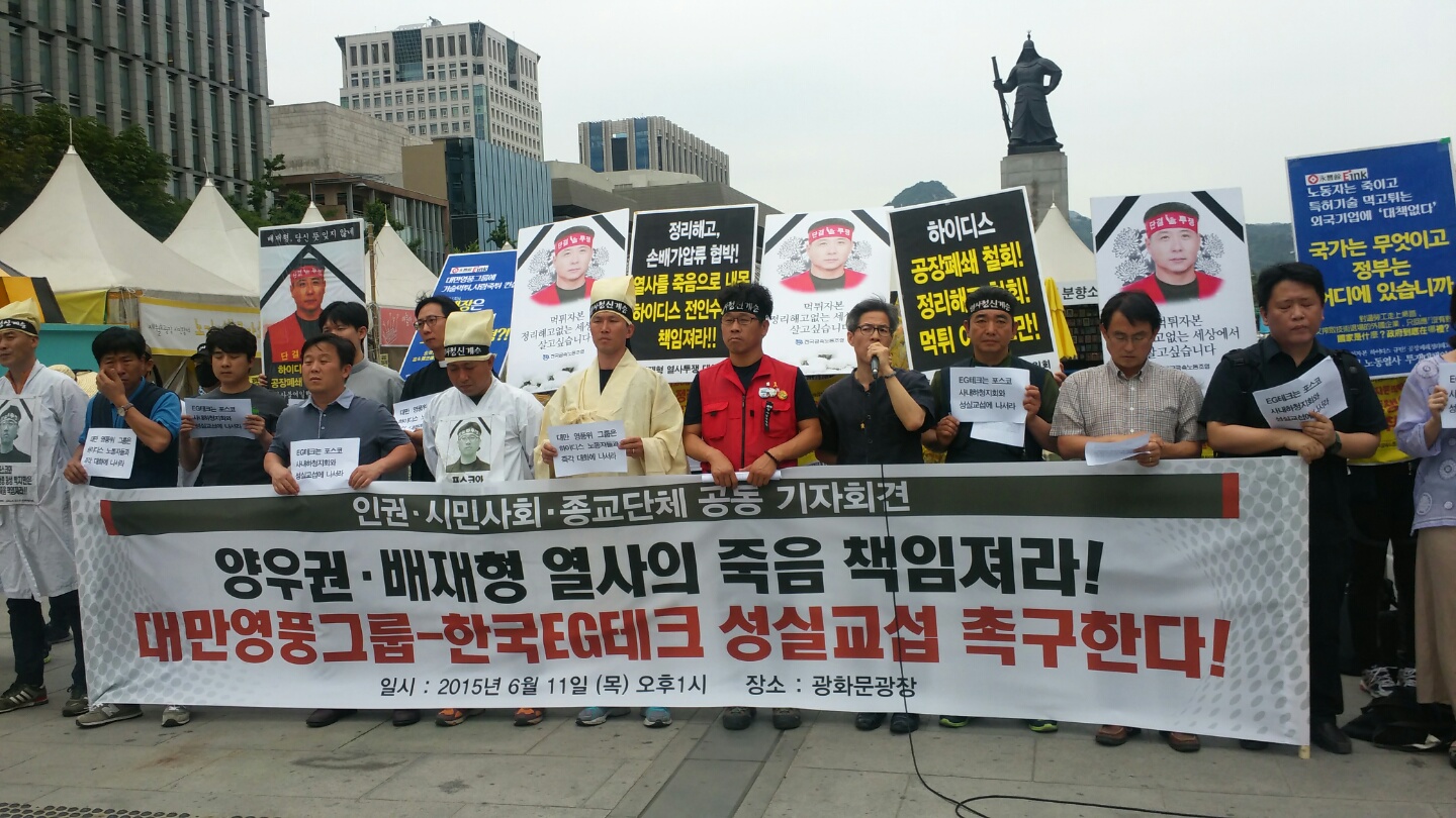 대만 영풍그룹과 한국의 EG테크는 하루라도 빨리 배재형, 양우권 열사 문제를 해결하기 위해 성실교섭에 나서야 합니다. 시민사회와 종교계는 두 노동자의 죽음에 대해, 그리고 노동자를 죽음으로 내몬 기업들의 냉혹한 이윤추구를 더 이상 묵과하지 않을 것입니다. 두 노동자의 죽음이 헛되지 않도록 하겠습니다. 죽어서까지 지키고자 했던 인간의 존엄과 노동의 가치를 함께 지키겠습니다. 두 노동자가 목숨을 버리면서까지 원했던 세상을 우리가 함께 만들어야 할 책임이 있습니다. 인권시민사회와 종교계가 함께하겠습니다.