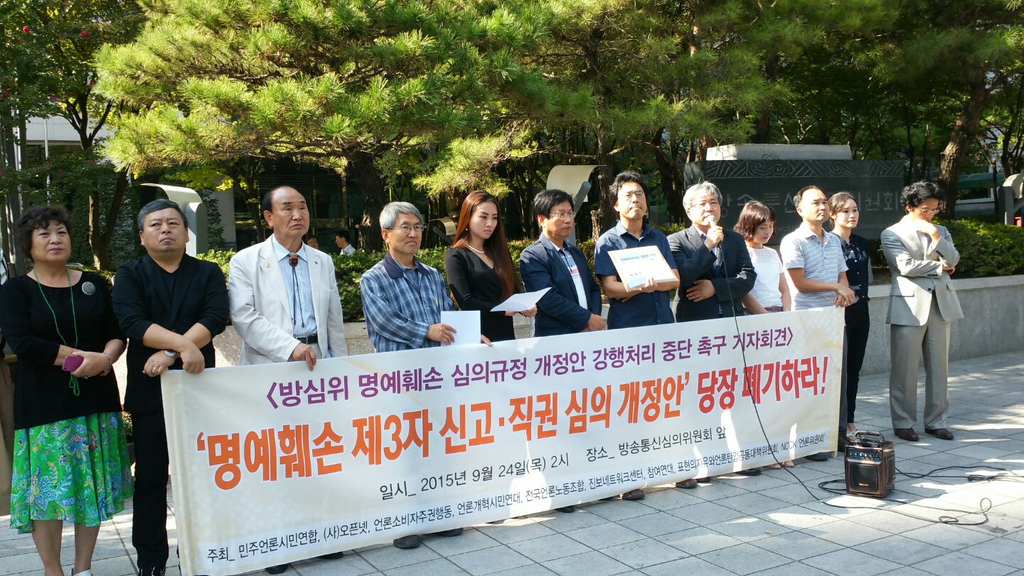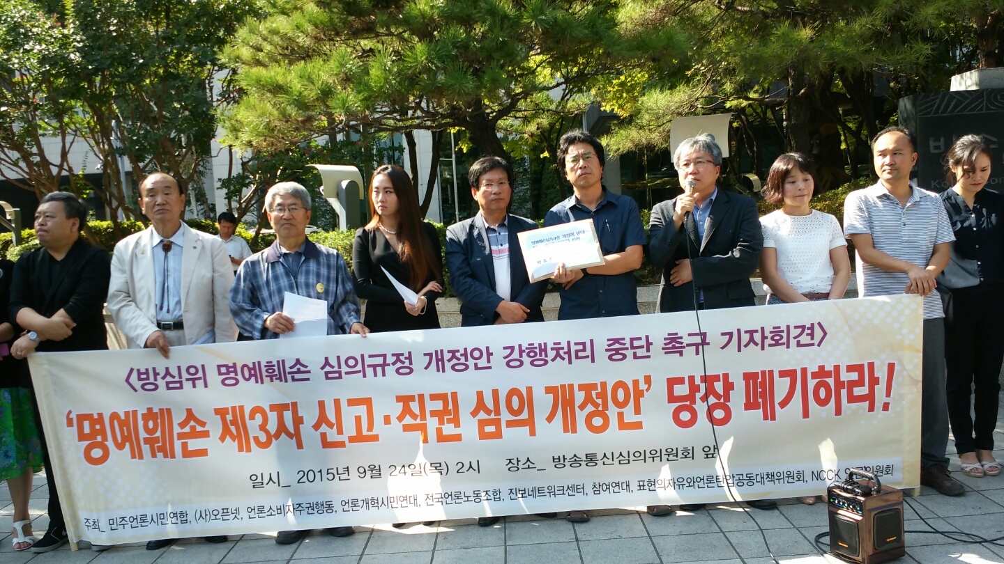[기자회견문]방심위<명예훼손 심의규정 개정안> 강행처리 중단 촉구(2015.9.24)방심위 <명예훼손 심의규정 개정안> 강행처리 중단을 촉구하는 시민사회단체 기자회견문