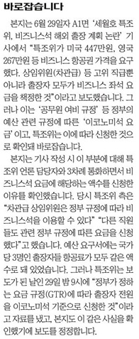 조선일보 1일 2면 하단에 실린 <바로잡습니다>에서는 “특조위가 미국 447만원, 영국 267만원 등 비즈니스 항공권 가격을 요구했다. 상임위원(차관급) 등 고위 직급뿐 아니라 출장자 모두가 비즈니스 좌석 요금을 책정한 것”이라고 보도한 것을 언급했다. 또 “그러나 이는 ‘공무원 여비 규정’ 등 정부의 예산 관련 규정에 따른 ‘이코노미석 요금’이고 특조위는 이에 따라 신청한 것으로 확인돼 바로잡습니다”라고 보도했다. 여기까지만 보도하고 적절한 사과를 했다면 적당한 정정보도라고 볼 수 있다.