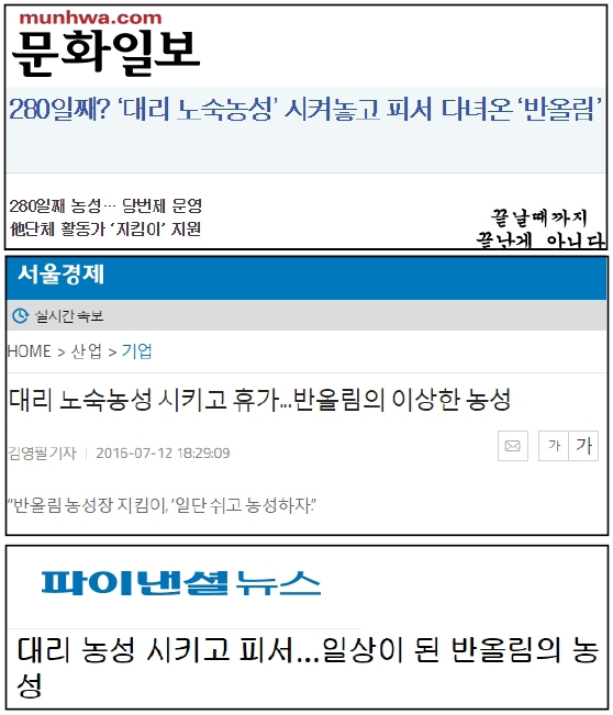 그런데 문화일보와 서울경제, 파이낸셜뉴스는 이런 진정성 없는 삼성의 일방적 행보에 대한 비판이나 지적은 없이 반올림이 ‘대리투쟁’을 맡기고 ‘놀고 왔다’는 황당한 주장을 펼치고 있는 것이다. 집회는 사전적으로도 “다수인이 일정한 공동목적을 달성하기 위하여” 모이는 것을 의미한다. 시위 역시 “많은 사람들이 공공연하게 의사를 표시”한다는 의미를 지니고 있다. 취지에 동의하는 그 누구라도 집회와 시위에 함께할 수 있는 것이다. 특히 300일이 다 되어가는 반올림 집회에서 주최 측의 ‘출석률’을 따지는 것은 치졸할 뿐 아니라 뜬금없다.