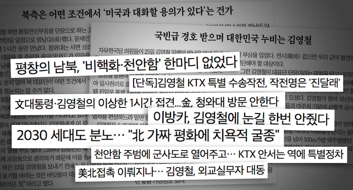 2월 26일 자 톱기사 <평창의 남북, ‘비핵화·천안함’ 한마디 없었다>를 비롯해서 <김영철 KTX 특별 수송작전, 작전명은 ‘진달래’>, <文대통령·김영철의 이상한 1시간 접견...金, 청와대 방문 안한다>, <이방카, 김영철에 눈길 한번 안줬다>, <“北 가짜평화에 치욕적 굴종”, 2030 세대도 분노했다>, <천안함 주범에 군사도로 열어주고...KTX 안서는 역에 특별정차>, <김영철, 대미 외교실무자 대동, 美北 접촉 이뤄지나> 등 북한을 혐오하고 미국을 추종하는 기사가 넘쳐났다.
