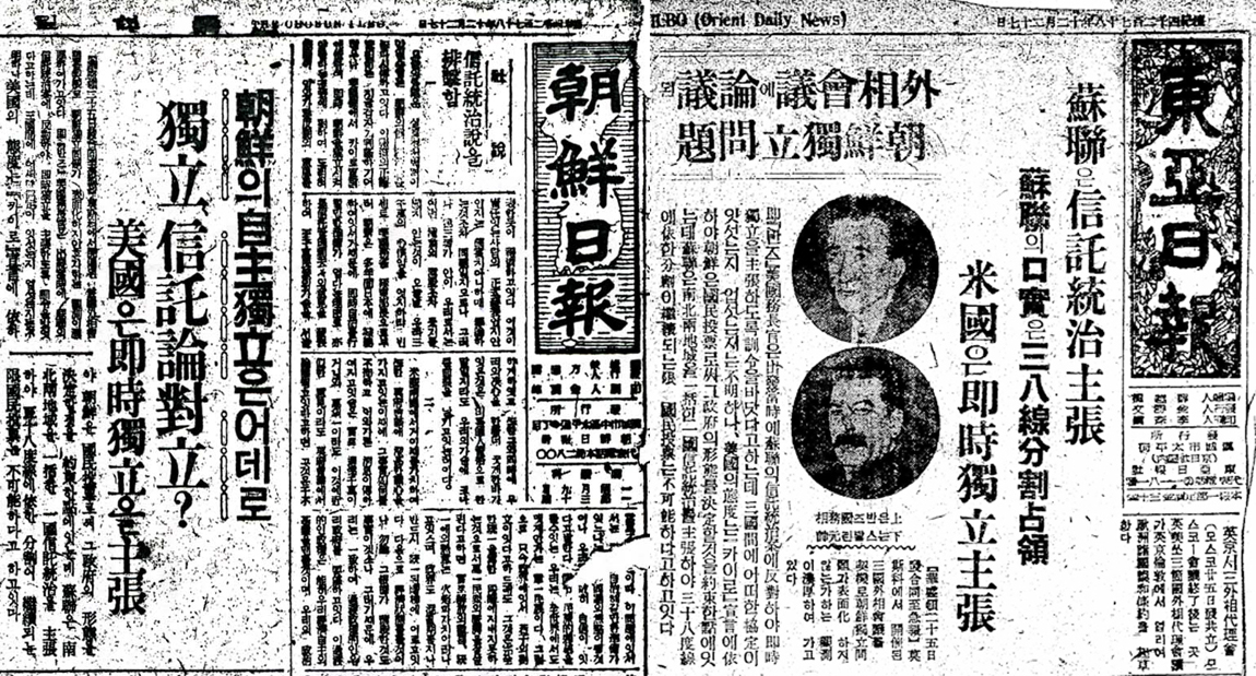 △ 미군은 독립운동가들을 배제하고 친일파를 중용하면서 친일신문 동아일보와 조선일보의 복간을 도왔고, 이 신문들은 모스크바 3상회의의 결정을 허위·날조 보도하여 신탁통치반대운동을 촉발시켰다. 사진은 1950년 12월 27일 관련 내용을 왜곡 보도한 조선일보(좌)와 동아일보(우) 1면.
