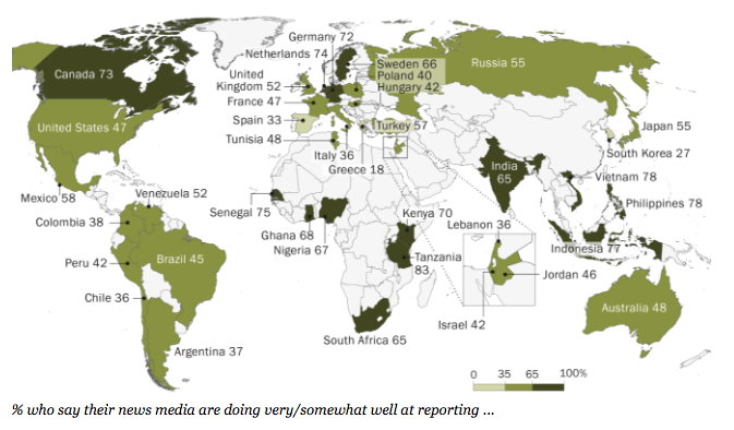 △ 미국의 퓨리서치 센터가 2018년 1월에 발표한 조사결과에 따르면, 한국의 언론이 ‘공정하지 않다’는 응답이 72%로 ‘공정하다’는 응답(26%)보다 훨씬 높은 것으로 나타났다. 이는 조사 대상 38개국 가운데 37위로, 꼴찌인 그리스(38위)보다 불과 한 단계 높은 순위다. (사진 : 퓨리서치 홈페이지 갈무리)