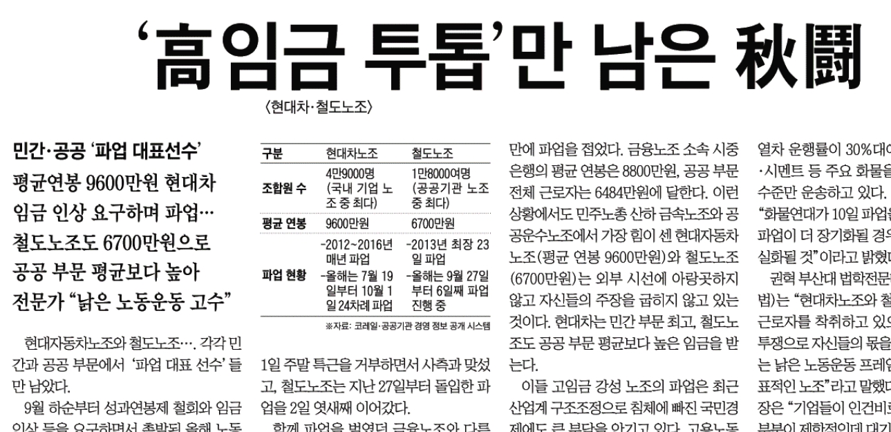 · <착취와 쟁취… 1980년대식 투쟁 매달리는 귀족勞組>(10/3, 3면, 손장훈·홍준기 기자, https://goo.gl/bYZ5Vb)