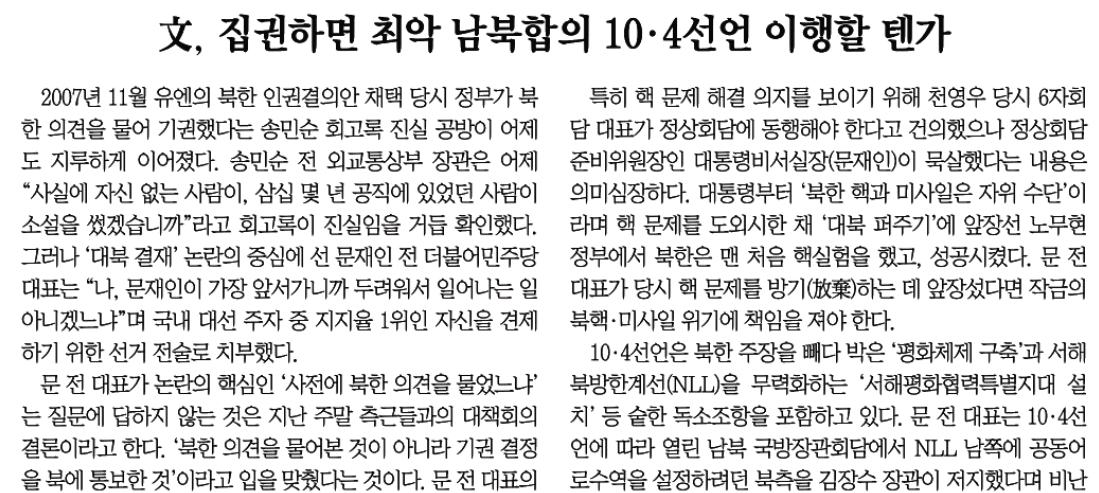 10·4선언 비난하며 문재인 전 대표 안보관에 의혹 표한 동아일보 <文, 집권하면 최악 남북합의 10·4선언 이행할 텐가> (10/19, https://goo.gl/BfBDHo)