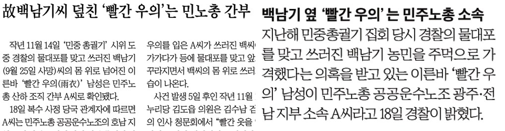 같은 날 중앙일보는 단신을 통해 빨간 우의 남성의 정체를 지적했다. <백남기 옆 ‘빨간 우의’는 민주노총 소속>의 전체 내용은 “지난해 민중총궐기 집회 당시 경찰의 물대포를 맞고 쓰러진 백남기 농민을 주먹으로 가격했다는 의혹을 받고 있는 이른바 ‘빨간 우의’ 남성이 민주노총 공공운수노조 광주·전남 지부 소속 A씨라고 18일 경찰이 밝혔다”가 전부다.