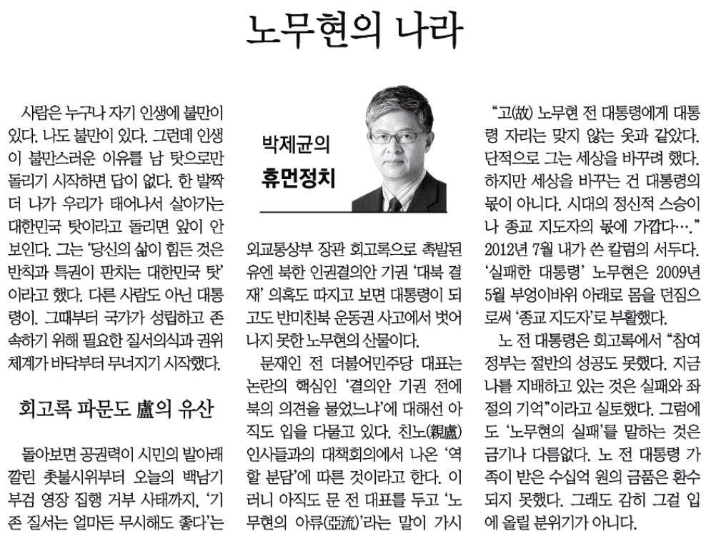 ‘송민순 회고록 논란’이 이후 ‘노무현 탓’이 등장하는 빈도수가 늘어나고 있다. 동아일보 박제균 논설위원도 노무현 탓의 대열에 합류했다. 박 위원은 “공권력이 시민의 발아래 깔린 촛불시위부터 오늘의 백남기 부검 영장 집행 거부 사태까지, ‘기존 질서는 얼마든 무시해도 좋다’는 노무현의 유산”이라고 비아냥거렸다. 또한 “정당한 비판이, ‘팩트의 힘’이 먹히지 않는 작금의 세태는 노무현의 또 다른 유산”이란다. 한발 더 나아가 “북한 인권결의안 기권 ‘대북 결재’ 의혹도 따지고 보면 대통령이 되고도 반미친북 운동권 사고에서 벗어나지 못한 노무현의 산물”이란다.