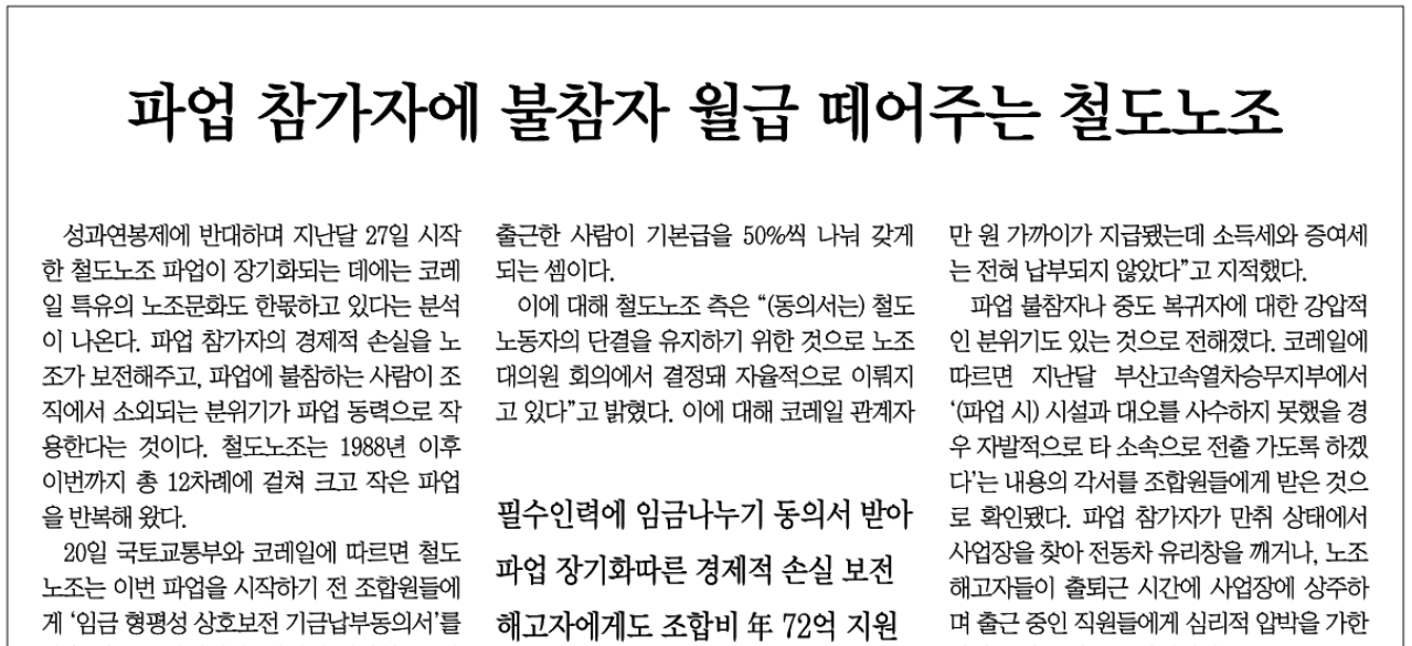 파업 장기화 원인 철도노조에 다 떠넘긴 동아일보 <파업 참가자에 불참자 월급 떼어주는 철도노조> (10/21, 12면, 김재영 기자, https://goo.gl/svmvyX)
