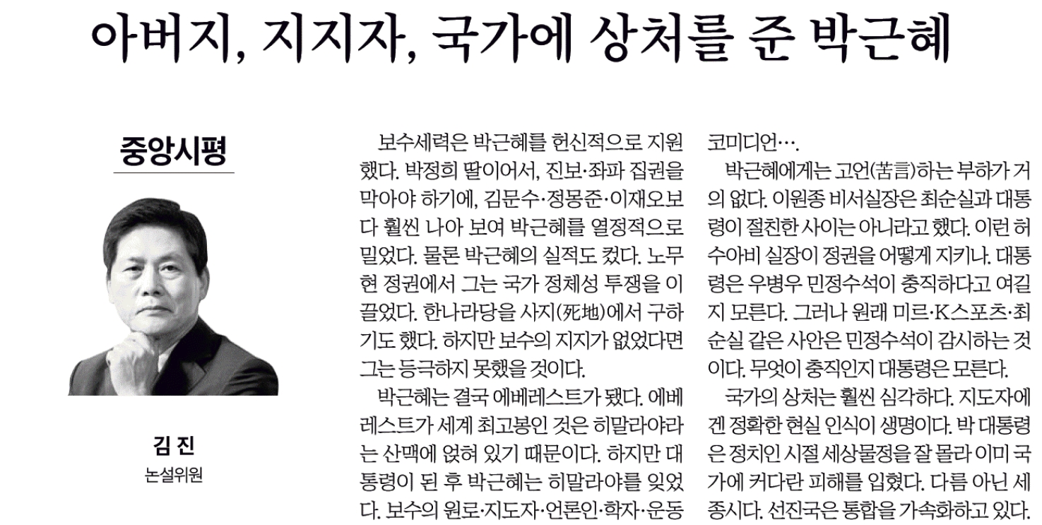중앙일보 김진 논설위원이 대세에 맞춰 최근의 최순실 국정농단 사태와 관련해 박근혜 대통령을 비판하는 칼럼을 내놨습니다. <중앙시평/아버지, 지지자, 국가에 상처를 준 박근혜>(10/26, https://goo.gl/FY7DxC)라는 제목만 봐서는 오죽하면 중앙일보도 이처럼 시원하게 박 대통령의 실정을 비판하나 싶었습니다.