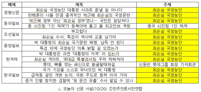 모든 매체가 사설을 통해 박근혜·최순실 국정농단 사태에 우려를 표하고, 이에 대한 박 대통령의 대국민 사과를 지적하는 한편, 특검 도입 등의 방안을 강구해야 한다고 주장했습니다. 이날 최순실 국정농단 사태가 아닌 다른 주제의 사설을 추가적으로 내놓은 곳은 동아일보와 한겨레입니다. 동아일보는 중국 공산당 제18기 중앙위원회 6차 전체회의 개막을 앞두고 시진핑 1인 체제가 굳어질 경우에 대비해 대책을 마련해야 한다는 주장을 펼쳤습니다. 한겨레는 신동빈 롯데그룹 회장이 25일 기자회견을 열어 대국민 사과와 함께 쇄신안을 발표한 것을 두고 "재판 결과와 관계없이 롯데는 뼈를 깎는 노력으로 환골탈태를 해야 한다"고 강조했습니다.