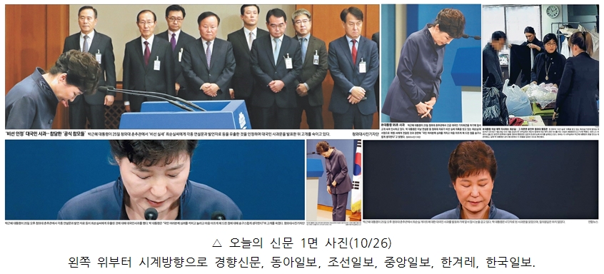 조선일보를 제외한 5개 일간지는 26일자 1면 사진에 모두 박근혜 대통령의 대국민사과 모습을 담았습니다. 이 중 경향신문은 사과하는 대통령 뒤에 ‘참담해하는’ 청와대 공식 참모들의 모습이 담긴 사진을 선택했습니다. 동아일보는 사진설명을 통해 사과가 ‘95초’였음을, 한국일보는 ‘질의응답이 없었음’을 부각했습니다. 중앙일보와 한겨레는 사과하는 모습 자체에만 주목했습니다. 조선일보는 전일 TV조선 단독 보도 내용을 1면 사진기사로 선정했습니다. 해당 사진에는 박 대통령의 의상 제작을 지시하는 최순실 씨와 최 씨와 동행한 윤전추 청와대 행정관의 모습이 담겨있네요.