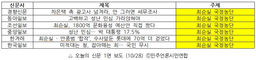경향신문과 한겨레는 자사 단독 보도를 28일자 1면 머리기사로 꼽았습니다. 먼저 경향신문은 차은택 씨와 차 씨의 측근 송성각 한국콘텐츠진흥원장이 민간 중소기업을 겁박해 이권을 챙기려한 사실을 폭로했습니다. 한겨레는 K스포츠 재단 내부 문건을 근거로 안종범 청와대 정책조정수석과 최순실 씨가 검찰 수사를 앞둔 롯데그룹의 처지를 이용해 돈을 받아낸 것 아니냐는 의혹을 제기했습니다. 조선일보는 최 씨와 그 측근들이 박 대통령의 ‘문화융성’ 사업의 관련 예산안까지 직접 만들고 검토했다는 TV조선의 단독 보도를 1면 머리기사로 받았습니다. 동아일보와 한국일보는 이번 사태 연루자들이 모두 변명으로 일관하고 있음을 지적했습니다. 중앙일보는 박 대통령의 지지율이 성난 민심을 반영하는 것이라 설명했습니다.