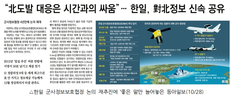동아일보 : “협정 가동되면 한국 얻는 이점 클 것. 북 위협에 맞서는 대응” (일본 군사력 한반도 진입 등의 문제점은 언급하지 않음)