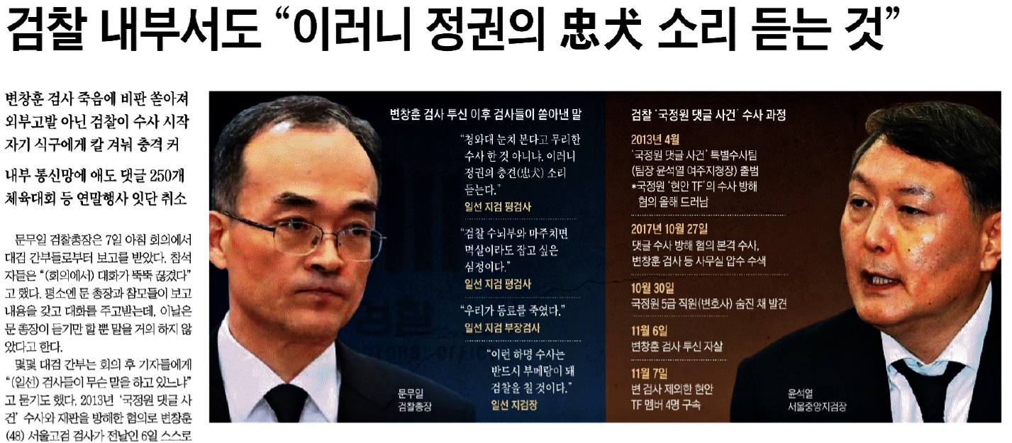 변창훈 검사 투신에 “정권 하명수사” 강조하는 조선일보국정원의 대선개입 사건에서 가짜 사무실 등으로 수사 및 재판을 방해한 혐의로 검찰 수사를 받던 변창훈 검사가 구속영장 실질심사를 앞둔 6일 투신해 사망했습니다. 이미 10월 30일에는 같은 혐의로 조사를 받은 정치호 변호사가 스스로 목숨을 끊었는데요. 핵심 인물로 지목된 장호중 전 부산지검장 등은 구속영장이 발부되었지만, 사건의 주요 참고인과 피의자가 연달아 사망해 수사에 차질이 빚을 가능성이 생겼습니다. 고인의 사망은 안타깝지만, 당시 권력의 입맛에 맞게 검찰이 수사를 방해한 혐의는 밝혀져야 할 행위인데요. 조선일보는 ‘정권의 하명수사’라며 인터넷의 일부 여론을 강조했습니다.