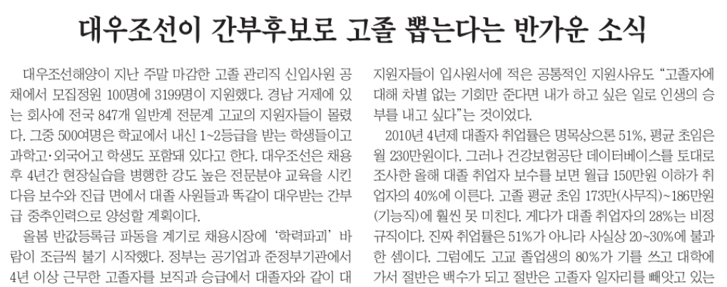 <대우조선이 간부후보로 고졸 뽑는다는 반가운 소식> (2011/10/13) 중 일부.