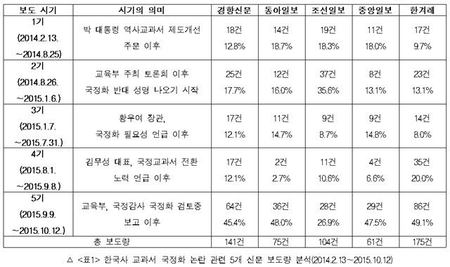 그 결과 20여개월간 총 보도량은 한겨레가 175건으로 압도적으로 많고, 중앙일보가 61건으로 가장 적었다. 한겨레는 특히 김무성 대표가 국정교과서로 전환코자 노력하고 있다는 언급을 한 이후부터 교육부의 국정감사 보고가 있기 전까지(아래 표에서 4기에 해당) 타사들이 역사교과서 국정화 이슈를 소홀히 할 때에도 이 사안을 집중적으로 다뤘다. 한편 국정화 반대 중차대한 사안에 대해서 20개월간 보도한 건수로 중앙일보 61건과 동아일보 75건은 사안을 회피했다고 해도 과언이 아닌 수준이다.