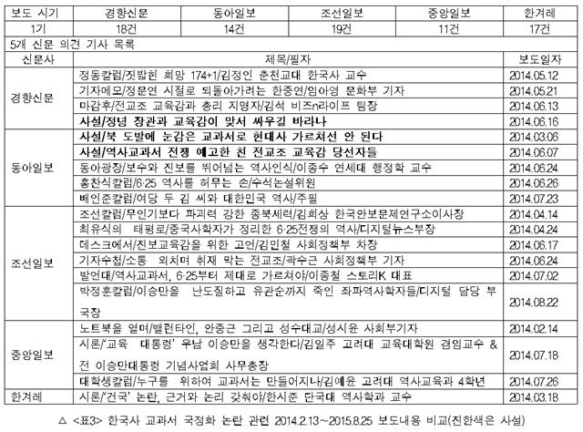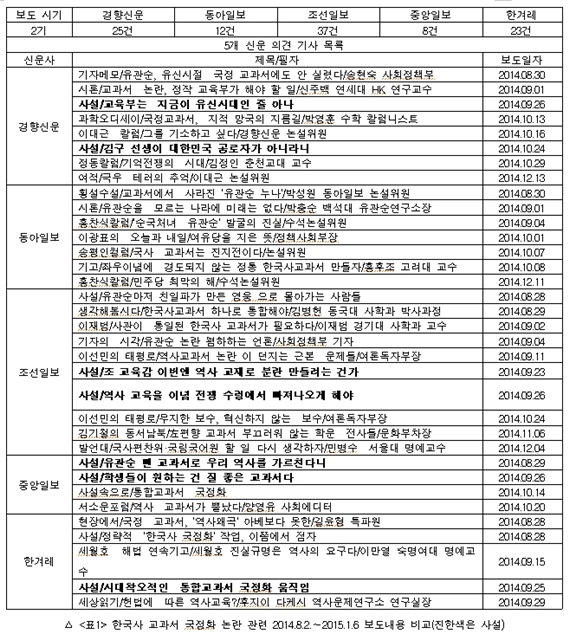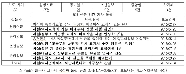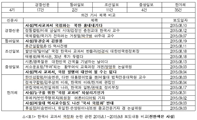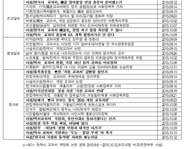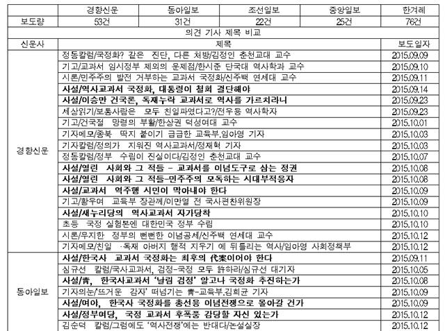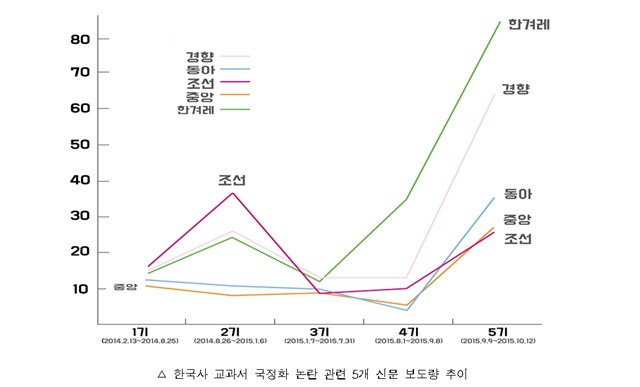 이 기간은 한겨레가 76건, 경향신문은 53건을 보도할 정도로 역사교과서 국정화가 가장 주요한 이슈였다. 그러나 조선은 22건, 중앙은 25건, 동아는 31건을 보도하는데 그쳤다.