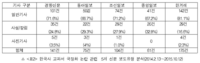 한겨레는 의견기사가 전체 기사대비 16.6%로 조중동에 비해서 일반기사 비중이 높았다. 반면 중앙일보는 사설‧칼럼의 비중이 32.8%로 가장 높았다. 사설 칼럼의 비중이 일반기사에 높다는 것은 교과서 관련해서 사실 전달에 치중하기보다는 주의 주장으로 치우쳤다는 의미로도 보인다. 한겨레와 경향이 142건, 101건으로 역사교과서 국정화의 문제점을 다양하게 기사화하는 동안, 조중동은 대체로 의견기사 중심으로 전했다고 봐도 좋을 것이다.