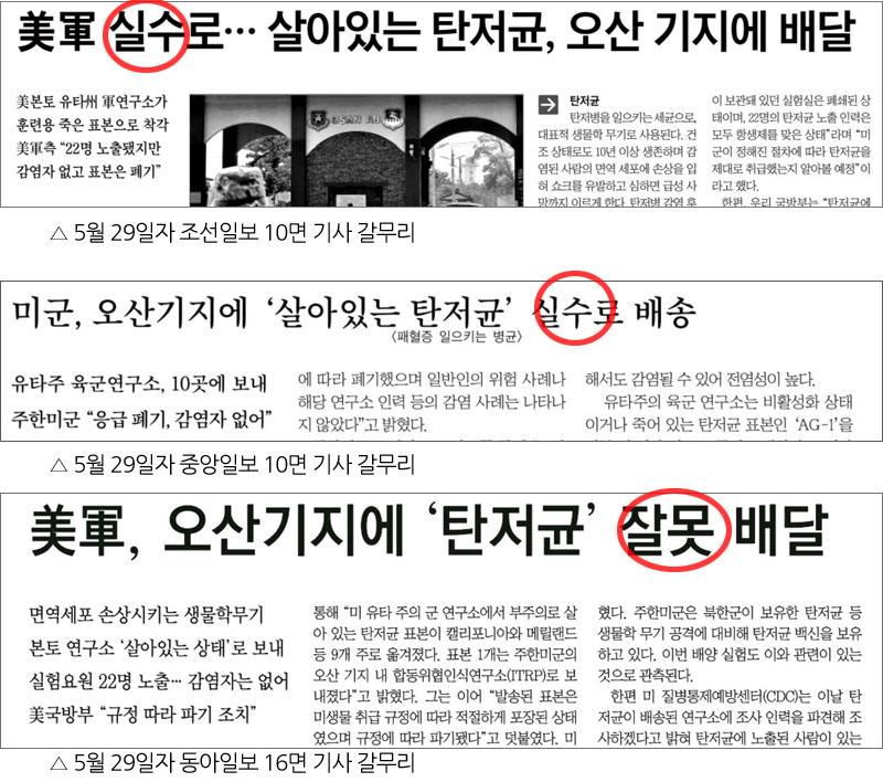 미군 사령부가 성명을 발표한 이튿날인 5월 29일, 조선·중앙·동아일보, 소위 ‘조중동’의 보도 제목에는 공통점이 있었다. <美軍 실수로… 살아 있는 탄저균 배달>(조선, 10면, 양승식), <미군, 오산기지에 살아있는 탄저균 실수로 배송>(중앙, 10면, 채병건), <미군, 오산기지에 탄저균 잘못 배달>(동아, 16면, 이승헌). 바로 ‘실수’라는 단어이다. 이들은 이번 사건이 단순 행정 실수였다는데 무게를 두며 안전사고가 발생하지 않았던 점을 강조했다. 이 중에서도 중앙일보는 미 국방부와 주한미군의 주장으로 완전히 채워져 있어서 문제의 심각성이 더했다. 조선일보와 동아일보는 그나마 사설을 통해 기본적인 정보 공개의 필요성을 주장하는 모습을 보였으나, 중앙일보는 끝내 침묵을 고수했다.