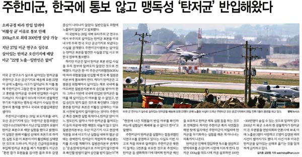 이번 사안에는 한겨레의 활약이 단연 돋보였다. 첫 보도인 <주한미군, 한국에 통보 않고 맹독성 탄저균 반입해왔다>(5/29, 3면, 김지훈·김양중)에서 사안의 본질이 ‘무단 반입’이었음을 정확히 짚어냈다. 미국이 이전부터 탄저균을 계속 반입해 왔으며, “미군 쪽은 정확한 실험 목적이나 들여온 탄저균의 양, 얼마나 자주 들여오는지의 의문에 대한 해명을 내놓지 않고 있다”고 지적했다. 미국 측의 사과 사실만을 보도했던 보수 언론과 대비되는 점이다. 한겨레의 문제 제기는 두 가지 방향으로 이어졌다.