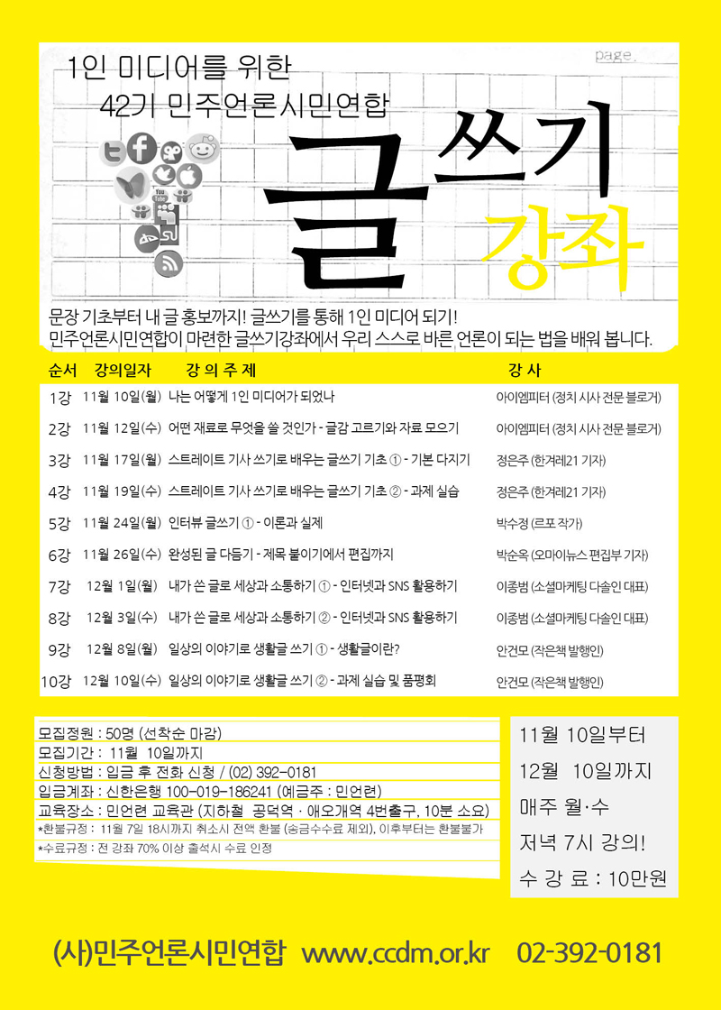 - 민주언론시민연합은 글쓰기에 관심 있는 시민들을 대상으로 2014년 11월 10일부터 시작되는 <2014 1인 미디어를 위한 42기 글쓰기강좌> 수강생을 모집합니다.