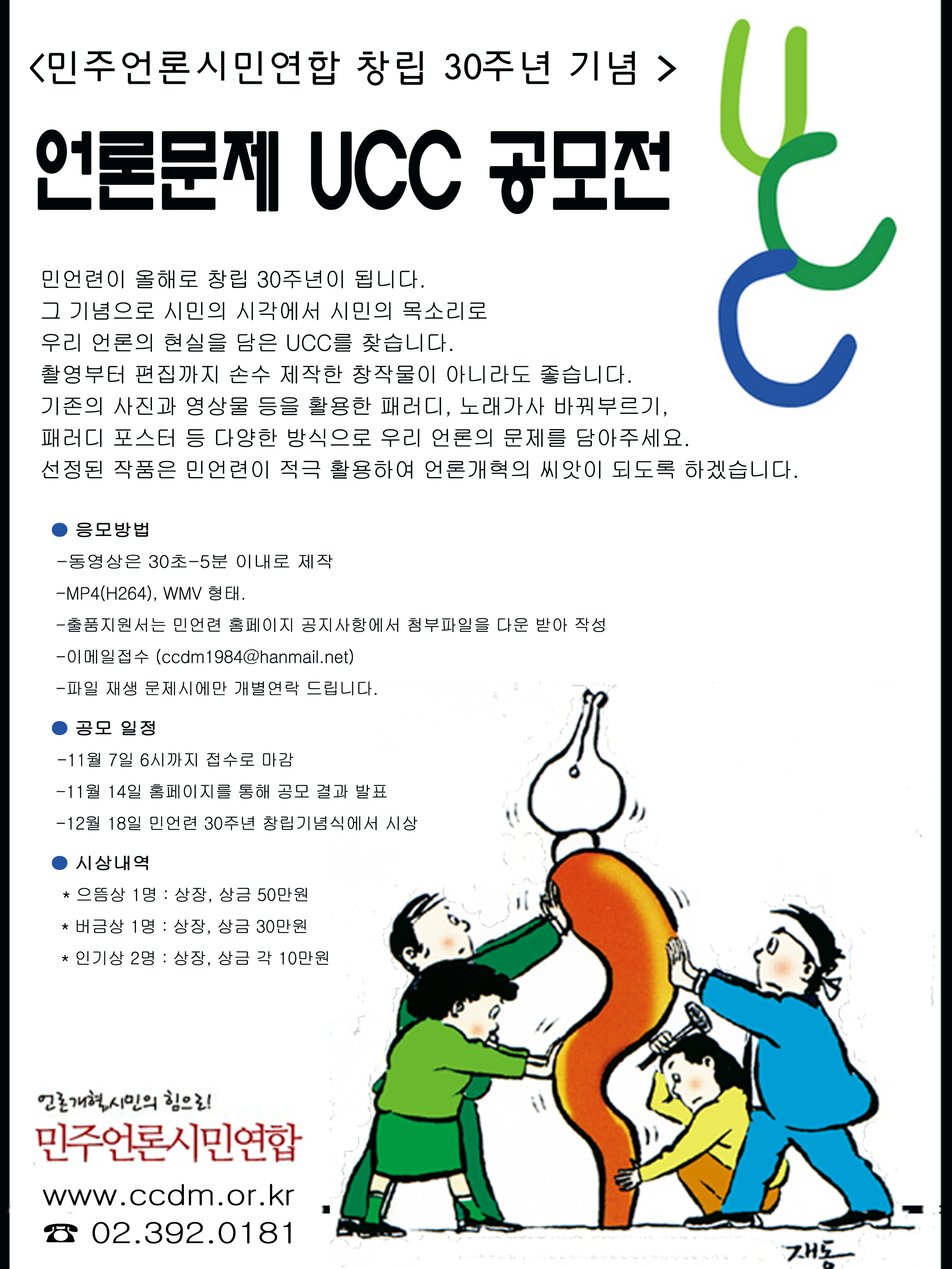 민주언론시민연합의 언론운동 역사 30년을 되돌아보고, 재도약 하기 위해 <한국사회 언론의 문제점>을 주제로 UCC를 공모합니다. 순수한 창작물뿐만 아니라 기존의 사진, 영상을 활용한 패러디 물도 가능합니다.