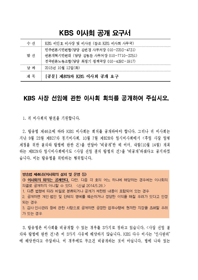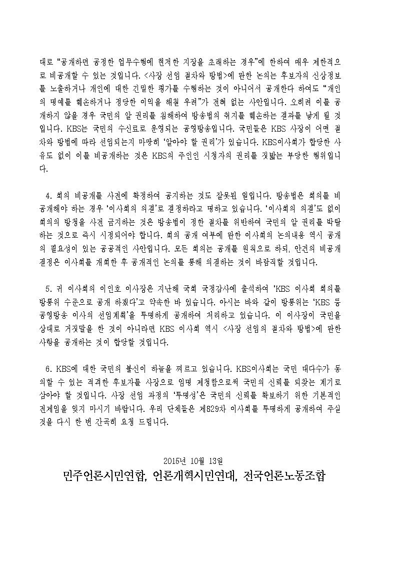 -. 이에 민주언론시민연합·언론개혁시민연대·전국언론노동조합 등 언론단체는 KBS 이사회 비공개는 국민의 알 권리를 침해하고, KBS의 주인인 시청자의 권리를 짓밟는 부당한 행위라고 지적하며 KBS 이사회에 [KBS 이사회 공개 요구서]를 제출했습니다.