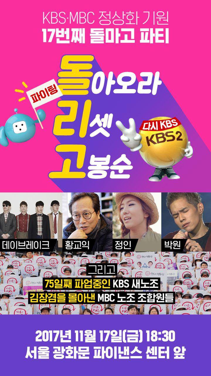 9년 간 부역자들과 싸워 온 전국언론노조KBS본부 조합원들은 물론, 유명가수들과 황교익 맛칼럼니스트가 KBS 적폐청산, 공영성 회복을 위해 함께 합니다. '돌아오라 리셋 고봉순'. 시민 여러분의 참여를 기다립니다. 평소보다 30분 빠른 저녁 6시 30분 입니다.