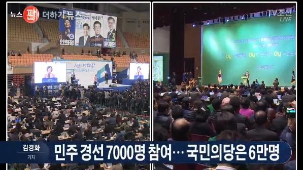 이에 그치지 않습니다. TV조선은 “왼쪽이 오늘 광주여대에서 열린 민주당 호남 경선장 상황이고, 오른쪽이 토요일에 있었던 국민의당 광주전남 경선 모습”이라며 민주당과 국민의당의 경선 인파를 비교하더니 “확연하게, 국민의당 경선에 훨씬 인파가 몰린 것처럼 보입니다”라고 설명했습니다. 정혜전 앵커는 “확실히 민주당쪽이 손님이 적군요”라고 재차 못 박았습니다. 그러나 정작 TV조선이 보여준 비교 화면을 봐서는 인파의 차이가 그리 커 보이지도 않습니다. 김경화 기자는 “27만명은 ARS로 참여하고, 또 수만명이 사전 현장투표에 참여했기 때문에, 오늘 현장에 올 필요는 사실 없습니다”라며 민주당 경선에 인파가 적은 이유를 설명하기는 했지만 “외형적으로는 10만명 가까이 몰린 국민의당 호남 경선이 좀 더 성공했다는 평가”, “일단 세 확장에는 성공한 셈”이라며 재차 ‘국민의당 경선 흥행’에 방점을 찍었습니다.