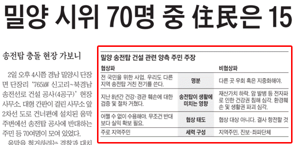조선일보는 3일 8면 <밀양 시위 70명 중 주민은 15명 가량…나머진 통진당 등 외부세력>에서 밀양 송전탑 건설을 둘러싼 갈등이 ‘밀양주민vs정부․한전’이 아니라 ‘찬성파 주민vs반대파 주민’의 구도에서 벌어진 것인 양 몰아갔다. 신문은 ‘협상파’, ‘비협상파’로 주민을 나눠 ‘무조건 적인 반대보다 실익확보 필요’를 요구하는 협상파가 ‘주로 지역주민’인 반면, ‘결사항전’을 외치는 이들은 지역주민 뿐 아니라 ‘진보․좌파단체’가 포함돼 있다고 보도했다.(그림1 참조)