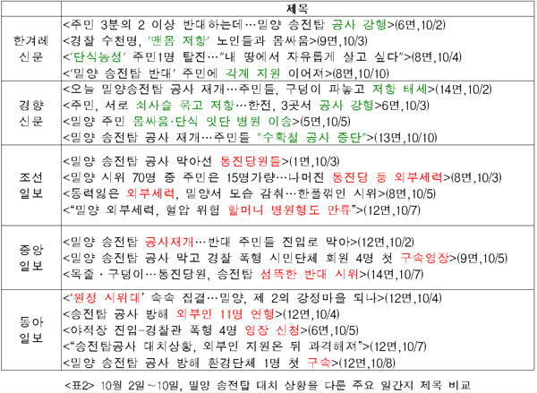 공사가 재개된 2일부터 14일까지 주요 일간지는 밀양 송전탑 공사와 관련된 기사와 사설을 내놨다. 언론사마다 기사 방향과 논조에 차이를 보였다.(표1 참조)