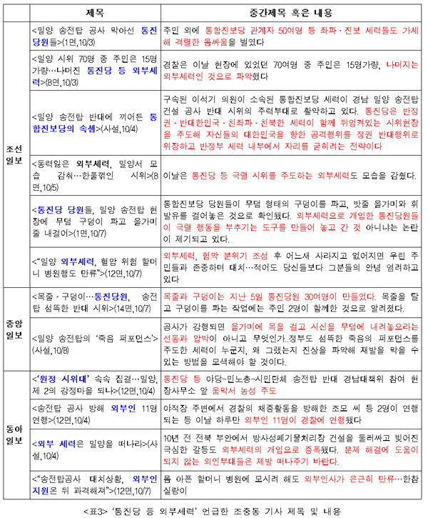 조중동은 밀양주민을 비롯한 대책위와 정부의 물리적 대치상황만을 끊임없이 강조했다. 외부세력이 주도해 시위가 폭력적으로 변하고 있다는 사실도 반복해서 언급했다. 그러나 조중동에서는 정작 밀양 송전탑 공사재개로 인한 갈등의 원인이나 해결방안을 모색하는 기사는 찾아볼 수 없었다.