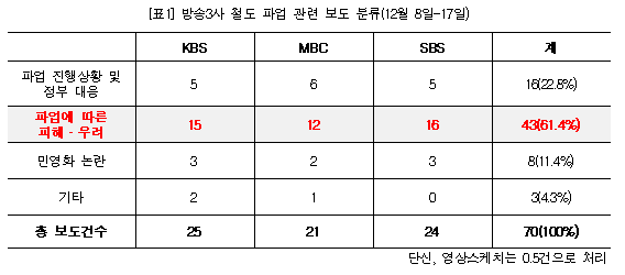 방송3사는 철도노조 파업과 관련해 파업 하루 전인 8일부터 17일까지 KBS 25건, MBC 21건, SBS 24건으로 총 70건의 보도를 내놨다. 이 가운데 파업에 따른 피해나 우려, 시민불편, 사건 사고를 전하는 기사는 총 43건(61%)이나 차지했다. 정작 철도파업의 핵심 쟁점인 ‘민영화 논란’은 방송사별로 2~3건에 지나지 않았다.(표1 참조)