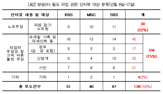 이러한 보도경향은 철도파업과 관련한 방송3사의 인터뷰 대상자 분류를 통해 보다 분명히 드러난다. 방송3사는 열흘간 총 138건의 인터뷰와 발언을 내보냈다. 노조의 입장을 전달하는 인터뷰는 30건(22%)인데 반해, 파업을 ‘불법’으로 규정하는 정부, 사측의 입장, 그리고 파업에 따른 피해를 반복해서 언급하는 인터뷰는 3배가 넘는 104건(75%)이나 보도했다.(표2 참조)