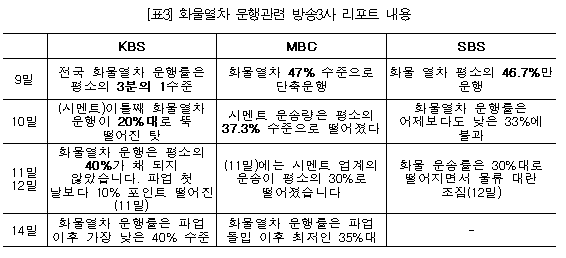 방송3사는 철도파업으로 화물열차 운행이 줄어 시멘트, 석탄 등의 업체가 물류대란을 겪고 있다고 보도했다. 파업이 시작되자 방송3사는 수치를 동원하며 화물열차 운행률이 ‘급격히’ 줄고 있다고 연일 강조했다. 그러나 방송사 별로 언급하는 수치가 다르거나, 한 방송사가 언급하는 수치가 들쑥날쑥하는 기이한 보도가 나오기도 했다.(표3 참조)