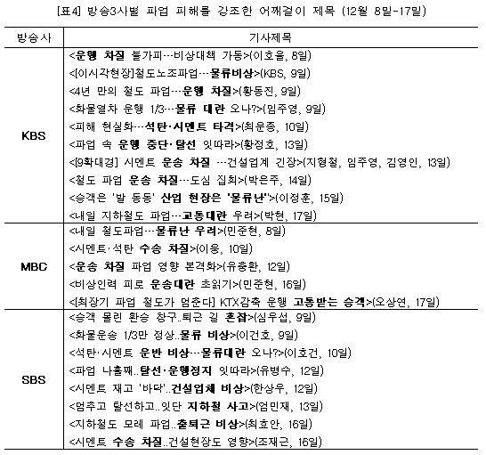 KBS와 MBC는 코레일 사측의 무리수와 ‘노사합의 불이행’은 언급하지 않은 채 “현재 투입된 대체 인력은 6천 명이 넘는다”, “긴급하게 투입되다 보니까 실수도 나고 근무 피로도 심하다고 한다”, “피로 누적으로 안전사고도 이어지는 상황”이라며 대체인력의 피로도 문제도 모조리 ‘파업하는 노조탓’으로 돌리는 듯한 보도를 내놨다.