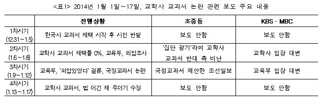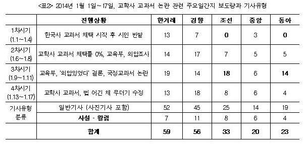 조중동과 KBS·MBC는 △교학사 교과서 채택 반대 움직임은 보도하지 않으며 ‘의제 죽이기’에 나섰다.(1차시기) △그러나 교학사 교과서 채택률이 0%대에 이르자 조중동은 일제히 ‘외압’ 논란을 제기했고, 교육부는 기다렸다는 듯이 ‘외압 특별 조사’에 나섰다. MBC는 교학사의 견해를 대변하는 듯 보도하면서 ‘교학사 교과서’가 피해자인 양 부각했다.(2차시기) △이어 조선일보는 ‘국정교과서 전환’ 주장을 펴기 시작했고, MBC와 KBS는 국정교과서 전환 혹은 교육부의 교과서 검정 전담 편수 조직 부활 입장을 일방적으로 전달했다.(3차시기) △2천 건이 넘게 수정된 교학사 교과서 문제는 약속이나 한 듯이 침묵했다.(4차시기)