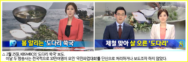 더욱 황당한 것은 이처럼 주요한 사안은 축소하고 외면한 MBC와 KBS가 마치 짜기라도 한 듯이 ‘도다리 쑥국’을 소개하는 리포트 보도를 했다는 점이다. 해당 보도는 ‘제철 맞은 도다리와 쑥을 함께 끓여 먹는 국’이라는 내용으로 1분 30초가량을 할애해 남해안의 대표적 봄철 음식을 소개했다. 공영방송사들이 이와 같이 뉴스가치가 떨어지는 내용은 입 맞춰 보도하면서 국민파업대회는 언급조차 하지 않거나 30초도 되지 않는 단신으로 처리한 것이다. 박근혜 정부 1년 실정을 비판하고 나선 국민들의 목소리가 ‘도다리 쑥국’에 밀렸다.