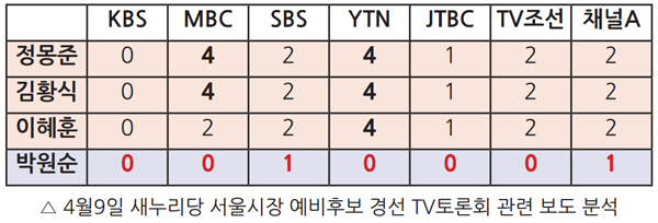 TV토론회 생중계에 대해서 동등 시간의 원칙을 요구하듯이 보도에서도 각 인물에 대한 최소한의 양적 균형은 맞추려 노력해야 한다. 선거보도에서 기계적 균형이 능사는 아니지만 지나치게 새누리당 후보들만 보도에 등장하는 것은 눈에 거슬린다. 향후 새누리당 경선토론회가 3번 더 열릴 예정이라는 점과 그들의 발언 중 박 시장 관련 공격성 내용이 많다는 점에서 앞으로 선거보도의 균형을 지키는 데 유의해야 할 것이다.