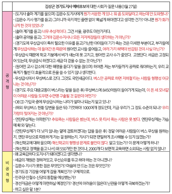 반면 3월 27일 새정치민주연합 김상곤 예비후보가 출연하자 진행자는 무상버스 공약을 소재삼아 “이 돈으로 세 모녀 같이 어려운 사람들 도와주면 수만명 구출한다”, “무상급식 때문에 여러 혜택이 반감된다”는 등 김 후보의 정책에 대해 시종일관 비판적 태도로 질문했다. 출마이유를 물으면서도 “김문수 도지사가 서운하게 한 것이 있나”, “화가 나게 한 것이 있었나?”는 등 감정적 이유로 출마를 한 것인 양 편향된 질문을 내놨다. 김상곤 후보에 대한 질문을 분석한 결과 공격형 질문은 15건, 비공격형 7건이다. (<표2> 참조)
