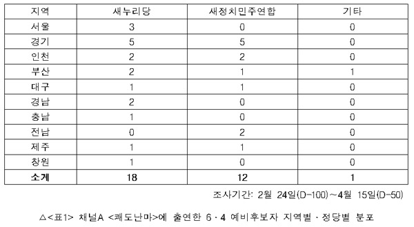 지난 50일동안 <쾌도난마>에는 예비후보 출마자가 총 31회(중복 출연 체크)에 걸쳐 출연했는데, 이중 새누리당 예비후보의 출연횟수는 18회로 58%를 차지했다. 새정치민주연합 후보는 12회 출연했으며, 부산지역에 무소속으로 출마한 오거돈 후보가 1회 출연했다. 인천, 경기, 제주 등에 예비후보를 낸 통합진보당이나 정의당 등 군소정당 후보들은 단 한 번도 출연하지 않았다.