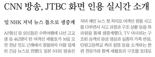 중앙일보는 17일자에서 세월호 사건을 대하는 외신들의 반응을 전하면서 제목을 <CNN 방송, JTBC 화면 인용 실시간 소개>라고 달았다. 기사에도 소개했듯이 CNN은 JTBC와도 제휴를 맺고 있는 방송이기에 그 화면을 가져다 쓴 것에 불과한데 무슨 큰 자랑이나 되는 듯이 제목을 뽑은 것은 세월호 사고를 자사 홍보에 가져다 쓴 저급한 기사이다. 중앙일보는 19일자 사설에서 <우리나라는 ‘삼류국가’였다>고 평하면서 “불신만이 지배하는 사회를 진정시키고 다독거릴 정부는 보이지 않고 오히려 헛발질하는 모습만 도처에서 돌출한다”고 썼다. 외신들이 일제히 긴급뉴스로 세월호 사고를 보도한 것은 우리로서는 참담하기 그지없다. 그 와중에 자사를 홍보하겠다고 ‘제목 장사’에 나선 중앙일보는 헛발질이 아니라고 자신할 수 있는가.