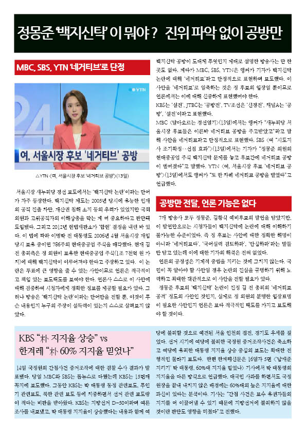 현재 방송의 선거보도는 천편일률적으로 ‘백지신탁 공방’이라는 말만을 전달하고 있다. 백지신탁 공방이 도대체 무엇인지 제대로 설명한 방송사는 단 한 곳도 없다. 게다가 MBC, SBS, YTN는 앵커가 기자가 백지신탁 논란에 대해 ‘네거티브’라고 단정적으로 표현하며 보도했다. 이 사안을 ‘네거티브’로 일축하는 것은 정 후보의 입장일 뿐이므로 언론에서는 이에 대해 신중하게 표현했어야 한다.