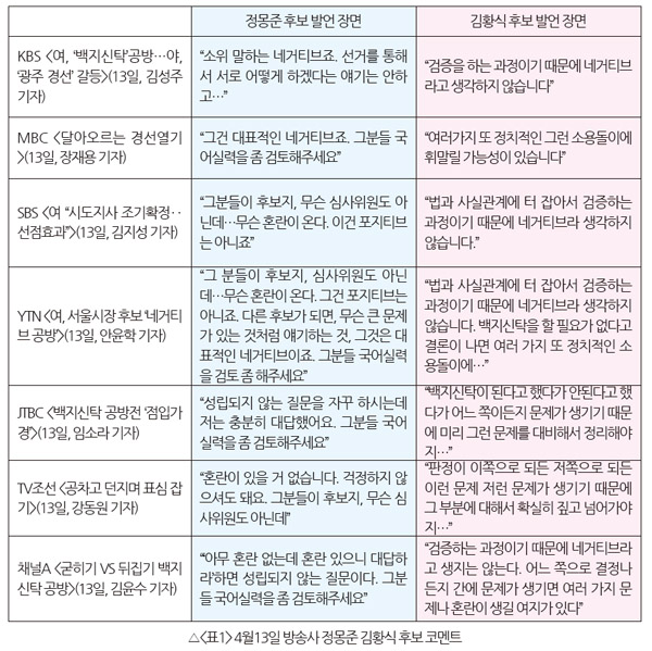 7개 방송사 모두 정몽준, 김황식 예비후보의 발언을 담았지만, 이 발언만으로는 시청자들이 백지신탁에 논란에 대해 이해하기 불가능한 수준이었다. (<표1> 4월13일 방송사 정몽준 김황식 후보 코멘트) 특히 이 멘트를 보면 정 후보는 사안에 대한 정확한 해명이 아니라 ‘네거티브다’, ‘국어실력 검토하라’, ‘안심하라’라는 말들만 담고 있는데 이에 대한 기자의 해석은 전혀 없었다.