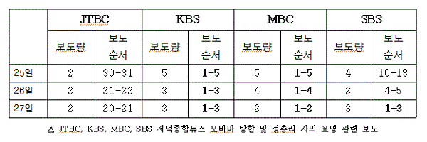 이러한 뉴스편집은 세월호 참사의 원인이 정부의 무능과 무대책에 있음이 밝혀지면서 지상파 3사가 세월호 보도를 정부에 불리한 의제라고 판단한 때문인가? 오바마 방한과 정 총리 사퇴 같은 이슈를 전면에 배치하는 것이 세월호로부터 국민의 시선을 돌리려는 국면전환용이라면 국민을 너무 우습게 보는 꼼수임을 모르는가. <끝>