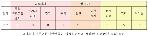 - 민언련이 심의 제출한 38건 중 법정제재 달랑 ‘1건’